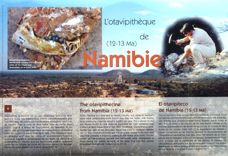 Seuls quelques squelettes plus ou moins complets ont été trouvés. Parmi ces derniers, on peut citer Proconsul nyanzae de l'île de Rusinga au Kenia (17.8 Ma), Lucy (Australopithecus afenrensis) de Hadar en Ethiopie (3Ma). Entre ces spécimens, on retrouve les nombreux fragments d'Orrorin tugenensis (Lukeino, Kenia, 6 Ma).